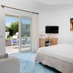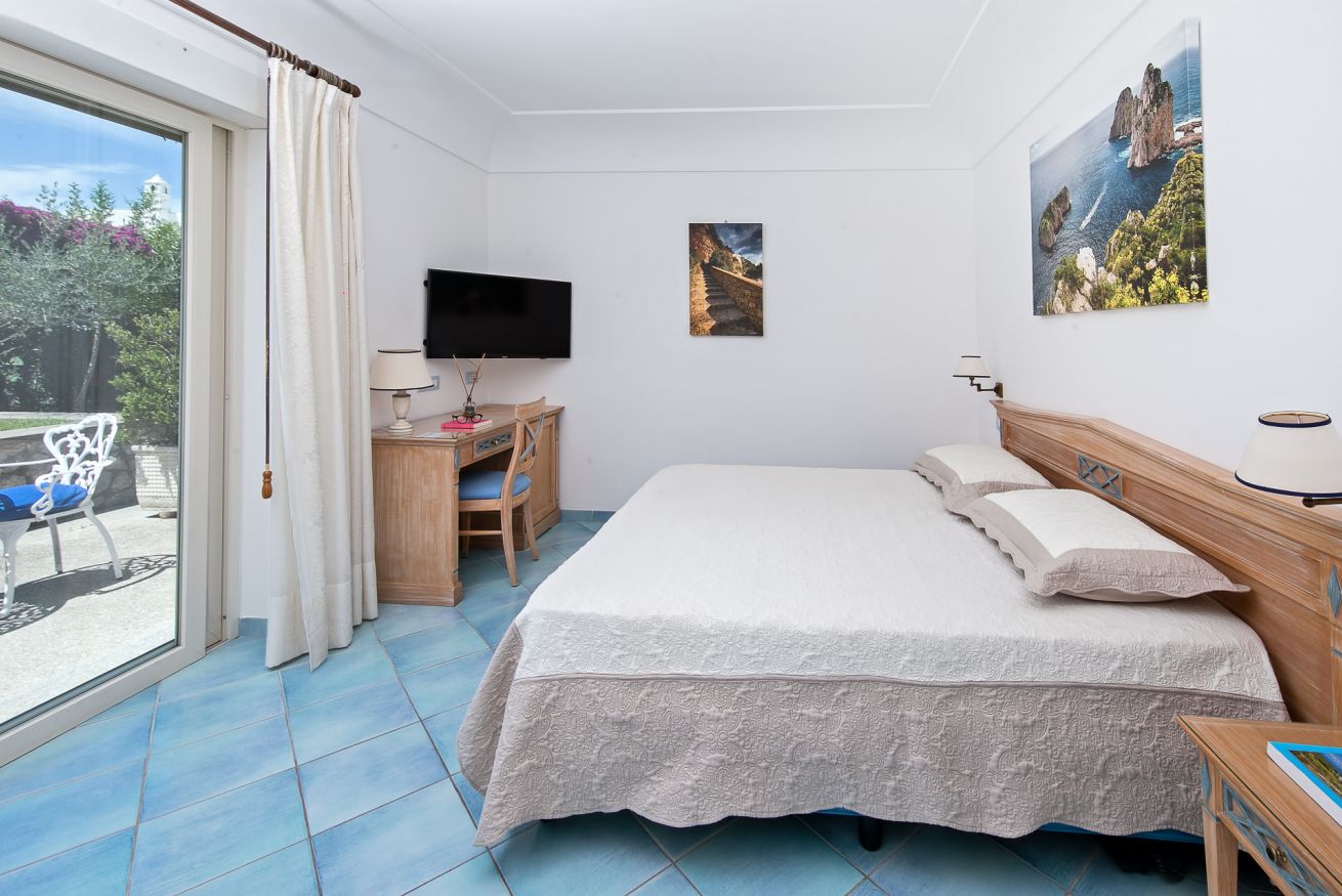 Camera ampia e luminosa, con letto matrimoniale king size, divano e proprio terrazzo-solarium privato cirondato da giardino e con accesso diretto alla zona relax con idromassaggio.